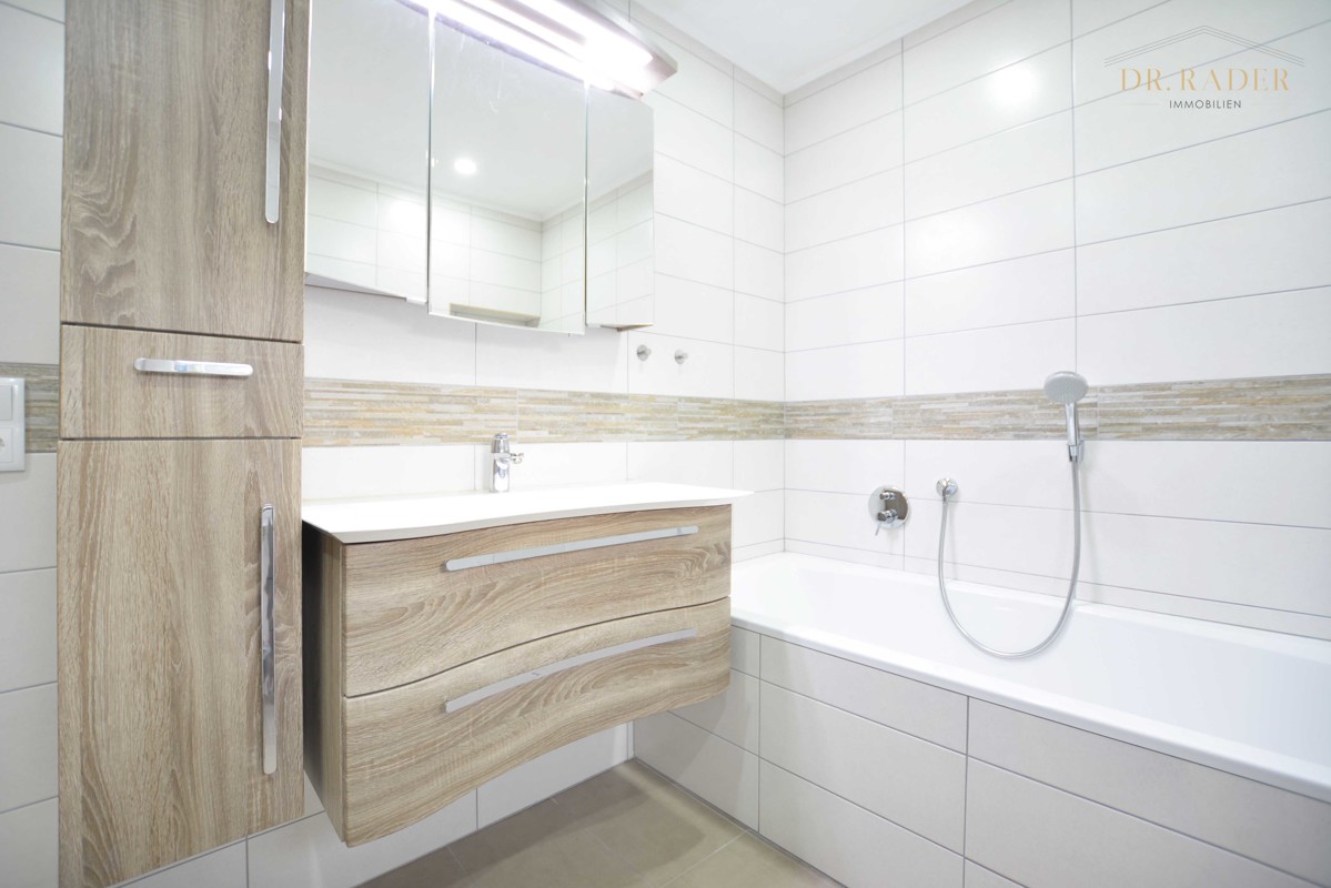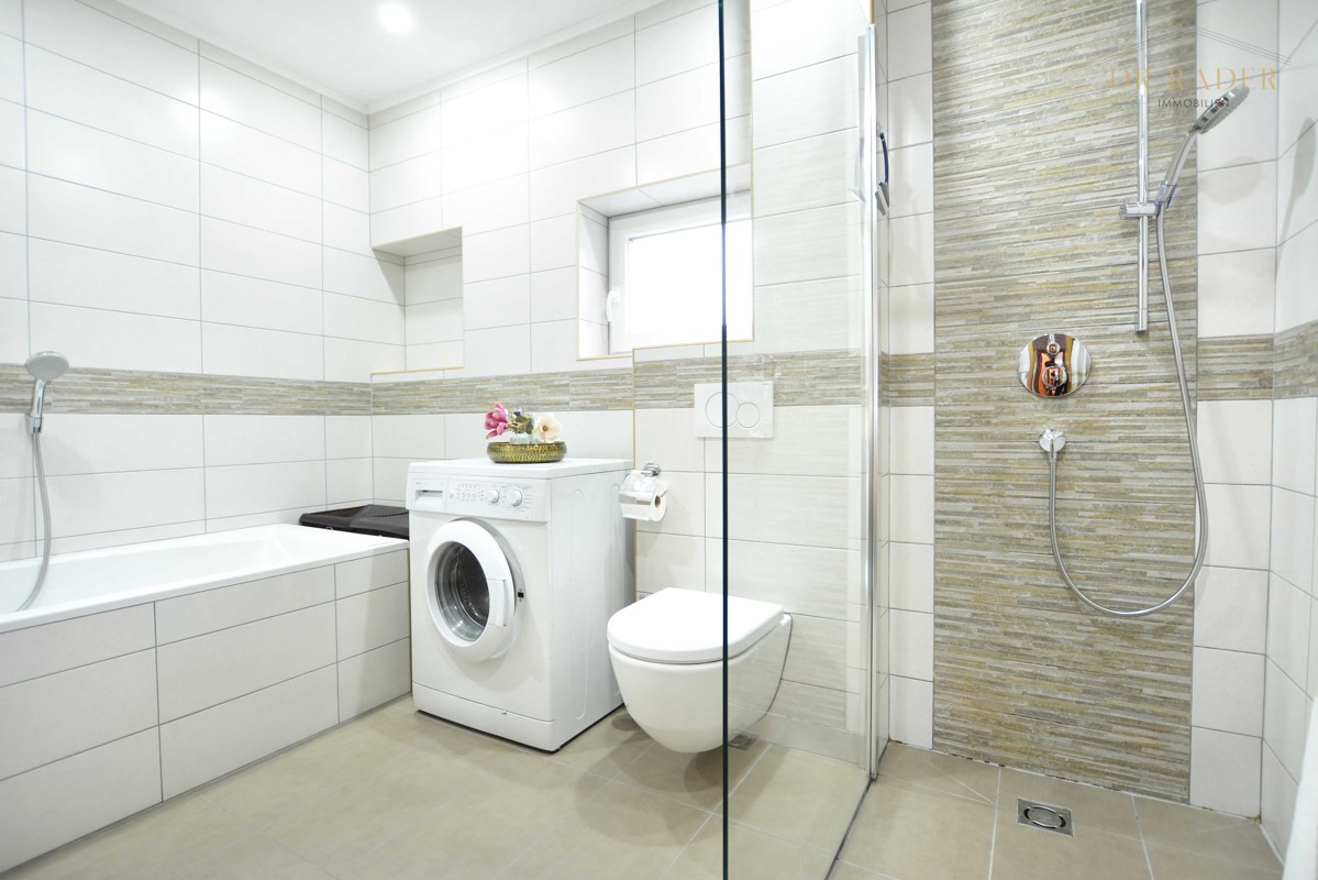 - Badausstattung: Dusche, Badewanne, Fenster im Badezimmer